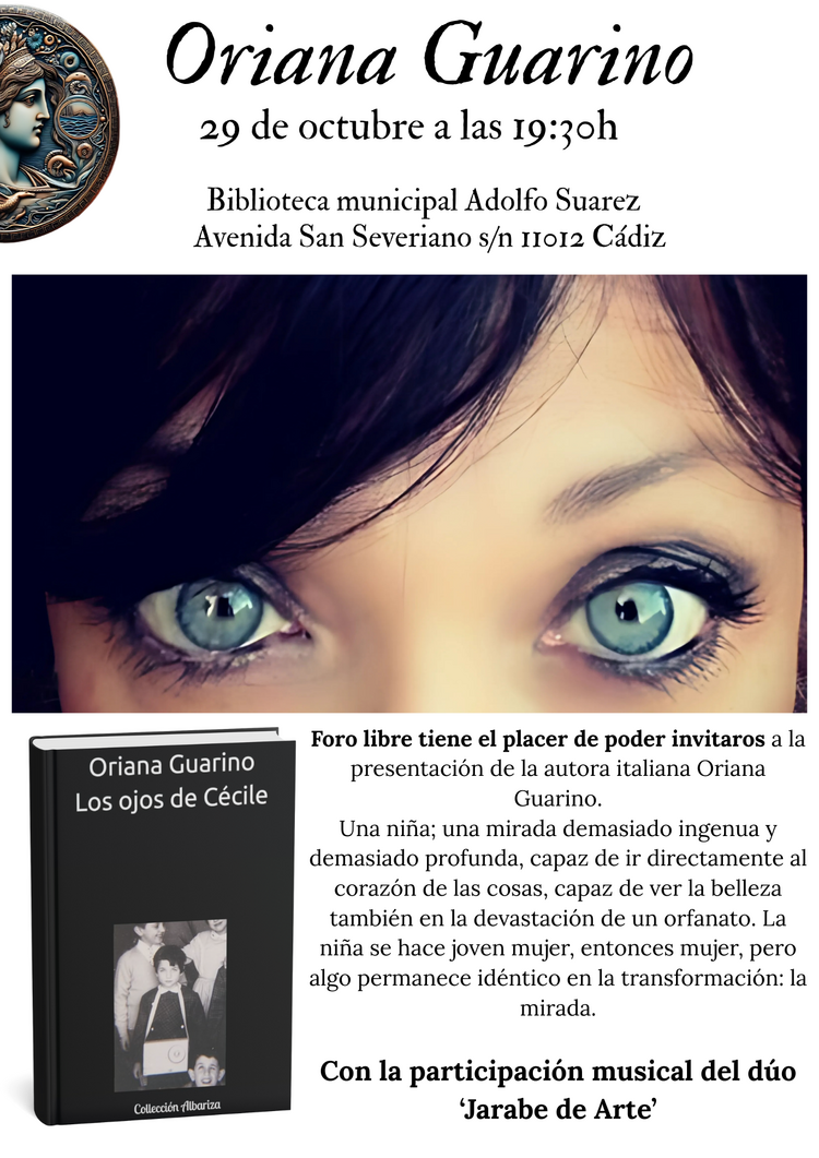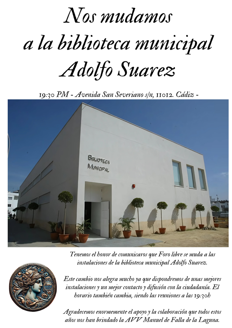 Me gustaría informaros que los lunes a las 19:30h en la biblioteca municipal Adolfo Suarez Avenida San Severiano s/n, 11012. Cádiz nos reunimos en la asociación cultural "Foro libre" en el que organizamos eventos culturales.